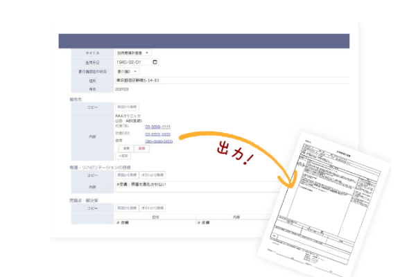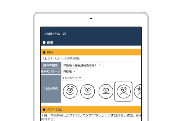 在宅看護の視点に基づいた看護問題やケアプランがあらかじめ登録されており、選択式に選ぶだけで簡単に看護計画が作成できます。ケアの成果を数値で表せるので、利用者様の状態の変化がわかりやすく、スタッフ間での情報共有もスムーズになります。