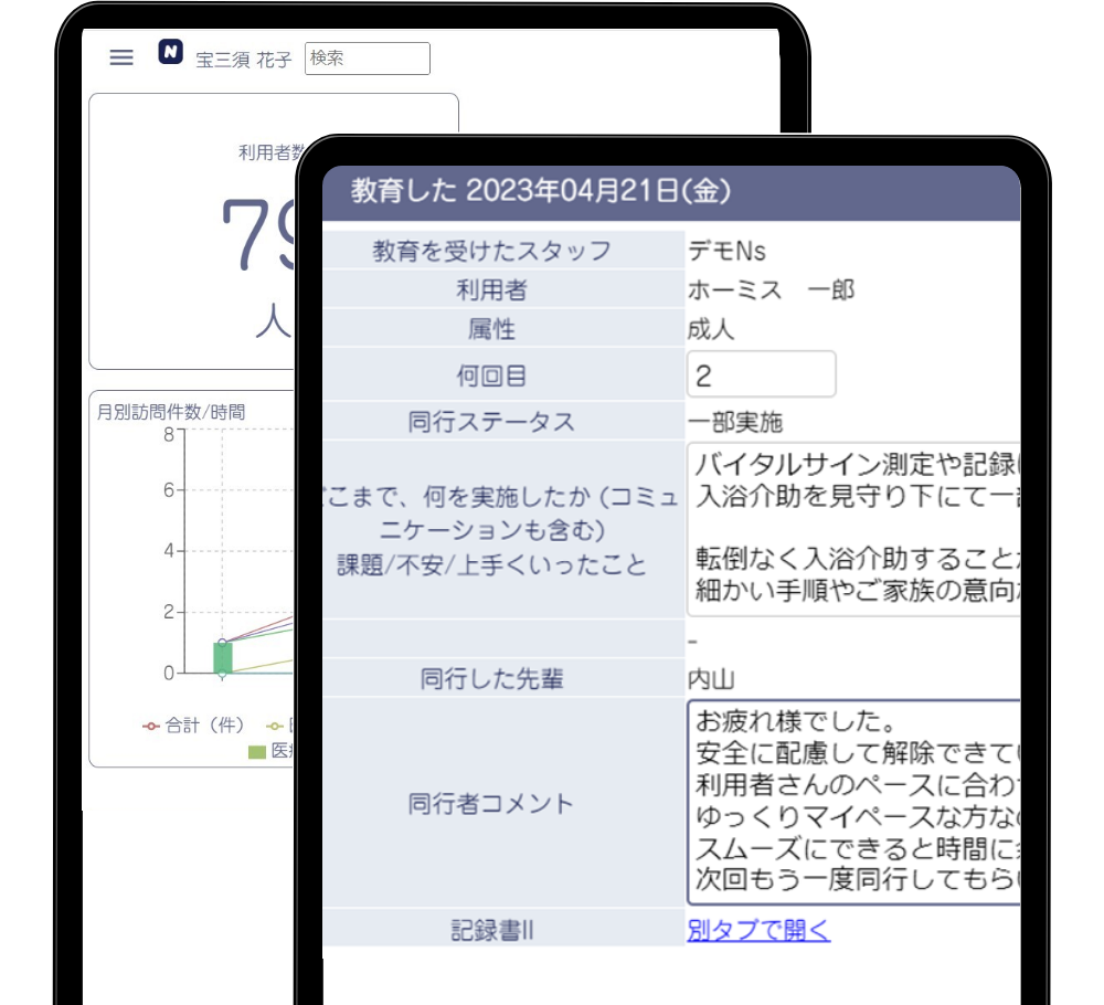 事業所の状態をサマリーで即座に判断できるだけではなく、スタッフひとり一人の業務量や看護の質まで見える化されるので、チームマネージメントや経営の改善点などがすぐに判断できます。